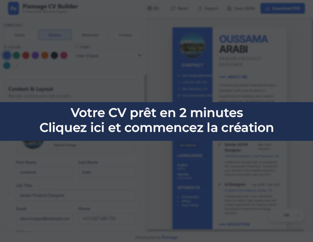 En quelques minutes, vous obtiendrez un CV clair, moderne et professionnel, prêt à être envoyé aux recruteurs.